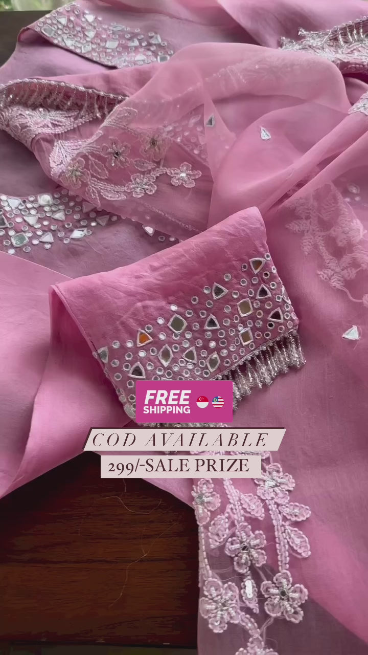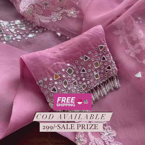 Silk organza kurta of candy pink shade a unique combination of mirror work fused with hand embroidered ari and intricate Chikankari on dupatta finished with shiny crystals creating a different combo of both the embellishments while at same time creating a summer ready outfit